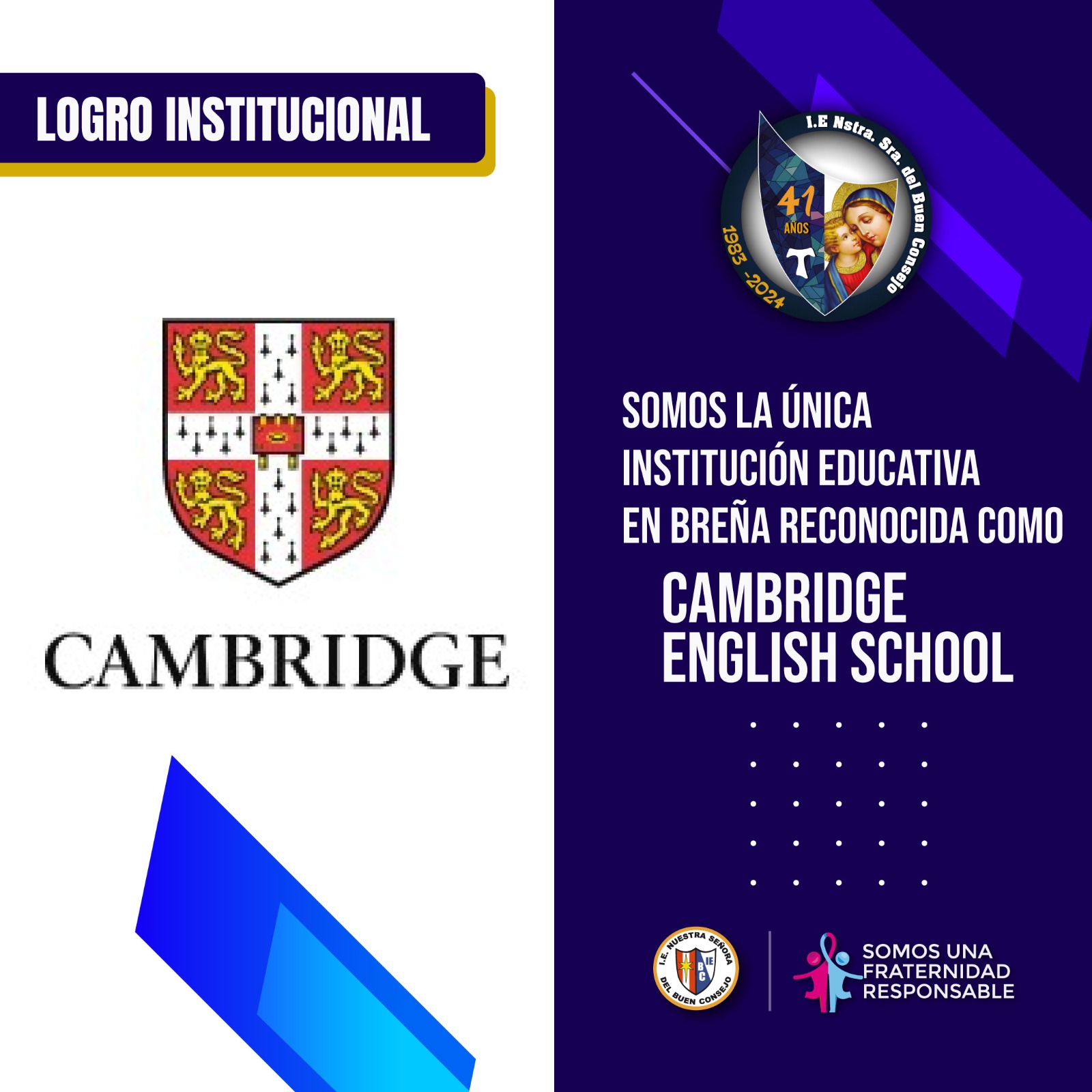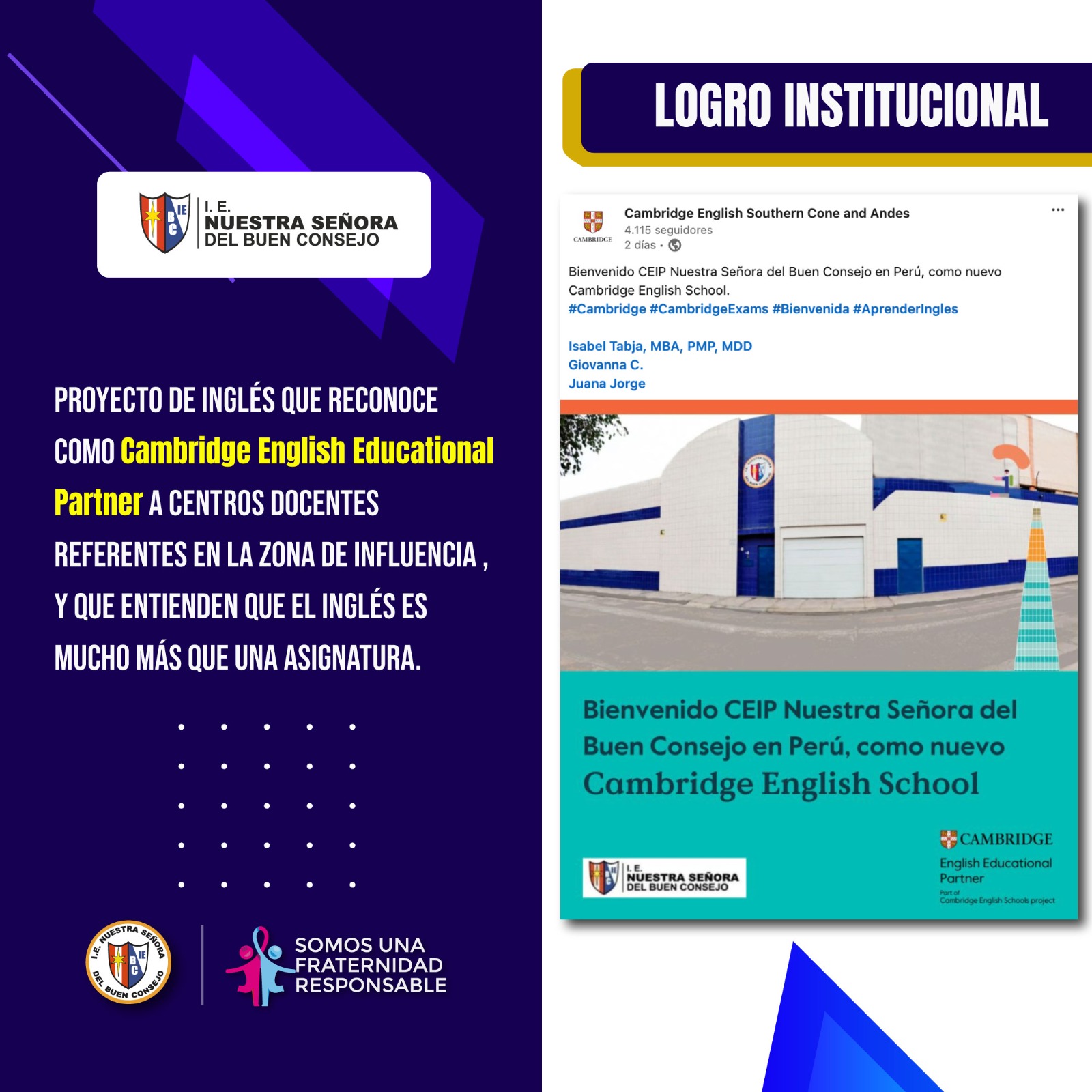 Con mucha alegría y satisfacción informamos que nuestra Institución Educativa es reconocida por Cambridge English School, siendo el único colegio de Breña con este reconocimiento. Este Convenio Institucional con Cambridge fortalece nuestros lazos con esta reconocida institución y que favorecerá a nuestro profesorado, alumnado y familias . Queremos agradecer por confiar en nuestra institución y por su continuo apoyo en la formación de futuros líderes globales.